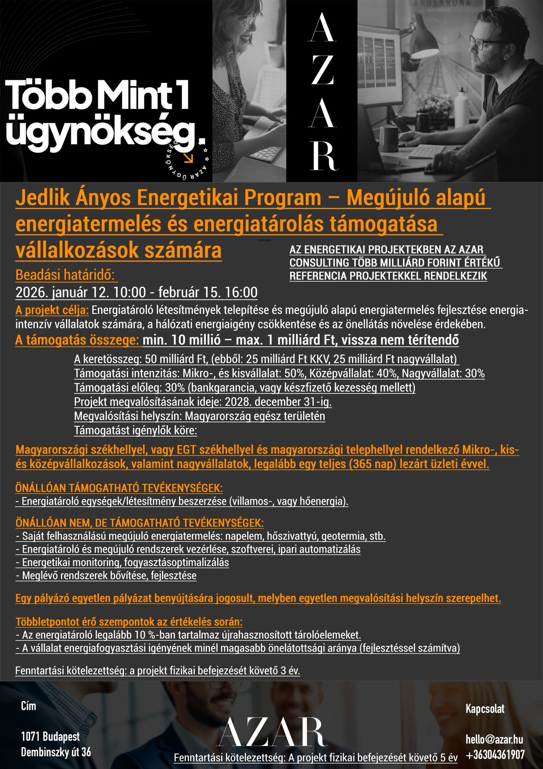 Energiatároló létesítmények telepítése és megújuló alapú energiatermelés fejlesztése energiaintenzív vállalatok számára, a hálózati energiaigény csökkentése és az önellátás növelése érdekében.